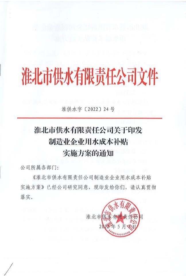 淮北市供水有限責(zé)任公司關(guān)于印發(fā)制造業(yè)企業(yè)用水成本補貼實施方案的通知 淮供水字【2022】24號